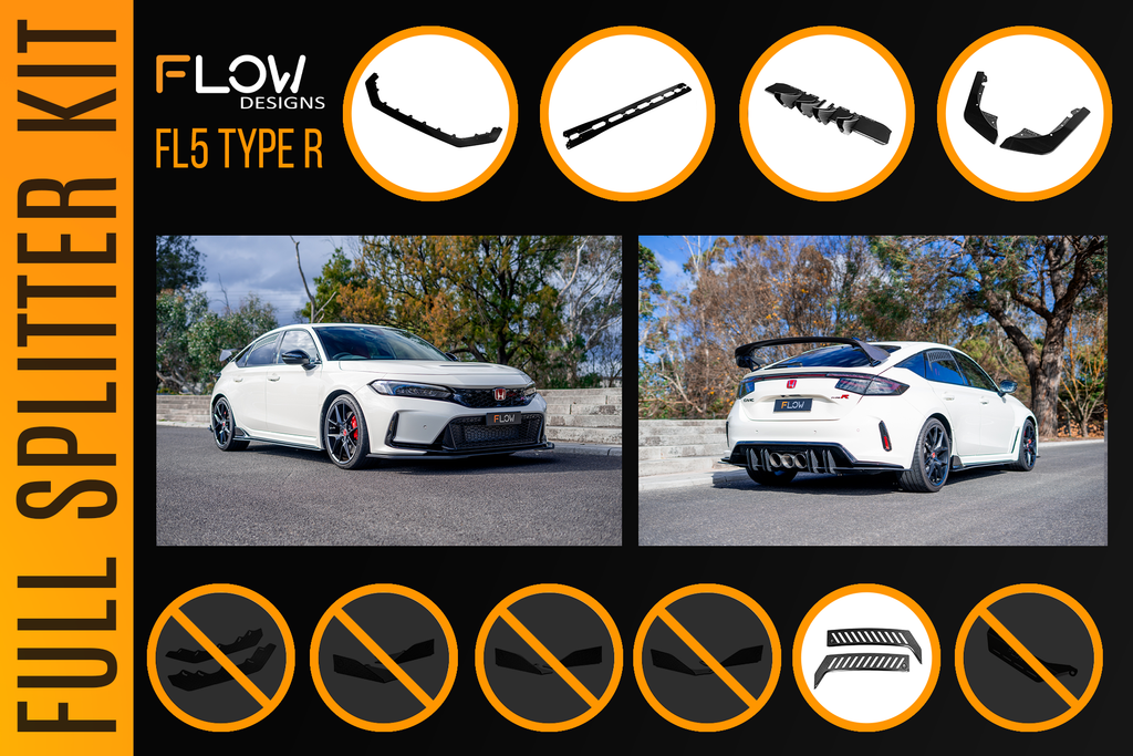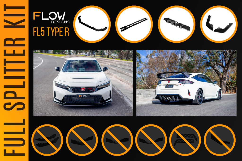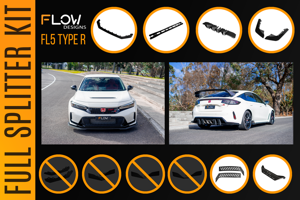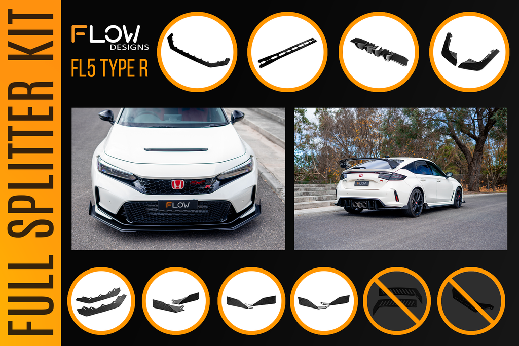 The FL5 Civic Type R body kit splitter set includes front lip splitter, side skirt splitters, Flow-Lock rear diffuser, rear bumper extensions and our full accessories range of front extensions and winglets all round. Easy installation instructions are included - we guarantee our FL5 Civic Type R body kit splitter set is the most durable on the market and will complete your exterior aesthetic by giving it a more aggressive look!