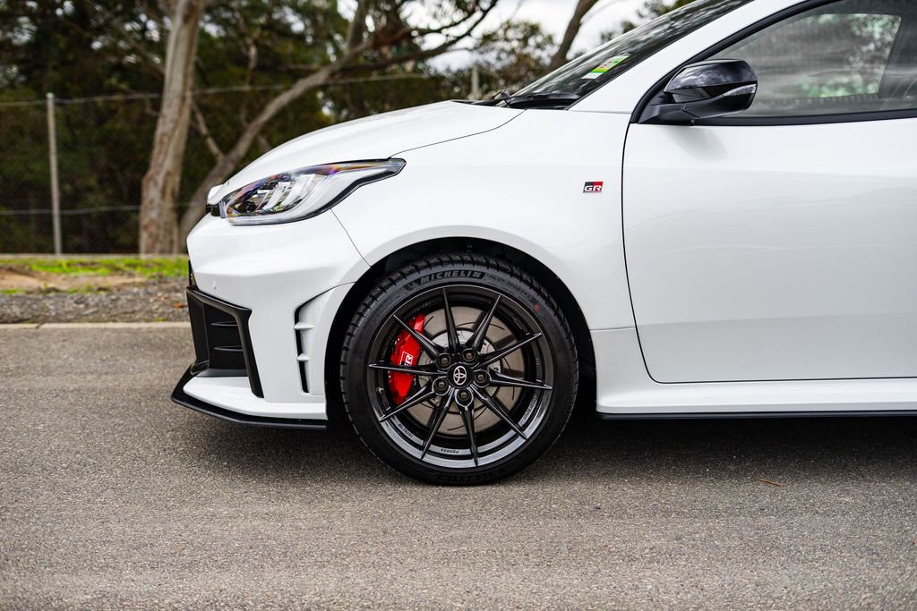 Our range of Yaris GR side winglets and accessories (both sold seperately) can be easily installed using the pre-pressed brass fittings already installed on your new splitter. These adjustable options allow you to match your car’s lines, including to compliment the ‘Poke” of aggressive offset wheels by up to 25mm!